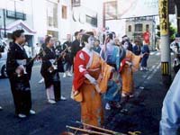 左:栄町の阿蘭陀万才 右:桶屋町の本踊(遭遇現場はカステラの福砂屋本店前)さらに鯨と御朱印船を求めて出島町〜江戸町をさまよい、ようやく遠くから聞こえてくる御朱印船のエキゾチックな鳴り物の音をキャッチ!すかさず走って追いかけます。御朱印船はその昔、アジアの海を股に掛けて活躍した荒木宗太郎という長崎の貿易商が、ベトナムの王女をお嫁さんにして長崎へ帰ってきた時の様子を再現した出し物です(その際の行列がどんなに華麗だったかを記した記録は残っていないけれど、長崎には豪華で賑やかな様を「アニオーさんの行列のごたる」と例えていう表現が残っています)。しかし私が船に追いついた時、船主である荒木宗太郎とアニオーさんは不在でちょっとさみしい印象でしたが、赤くて壮麗な船体が美しく、逆さVOC印がおしゃれでした。