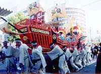 お諏訪さんの近所ではセミが鳴いておりました。そのくらい暑い日でした。それでも私はカッコ悪い日焼けをしてしまったショックにふらつきつつ、今日も追っかけです。ターゲットはまだ町なかで遭遇していない鯨と御朱印船!お諏訪さん近辺〜会える確率の高そうな丸山町辺りへ行ってみますと、またしても栄町と桶屋町に遭遇。ついでに船大工町と本石灰町の船格納庫を発見。地元の盛り上がっている様子に心が浮き立ちます。